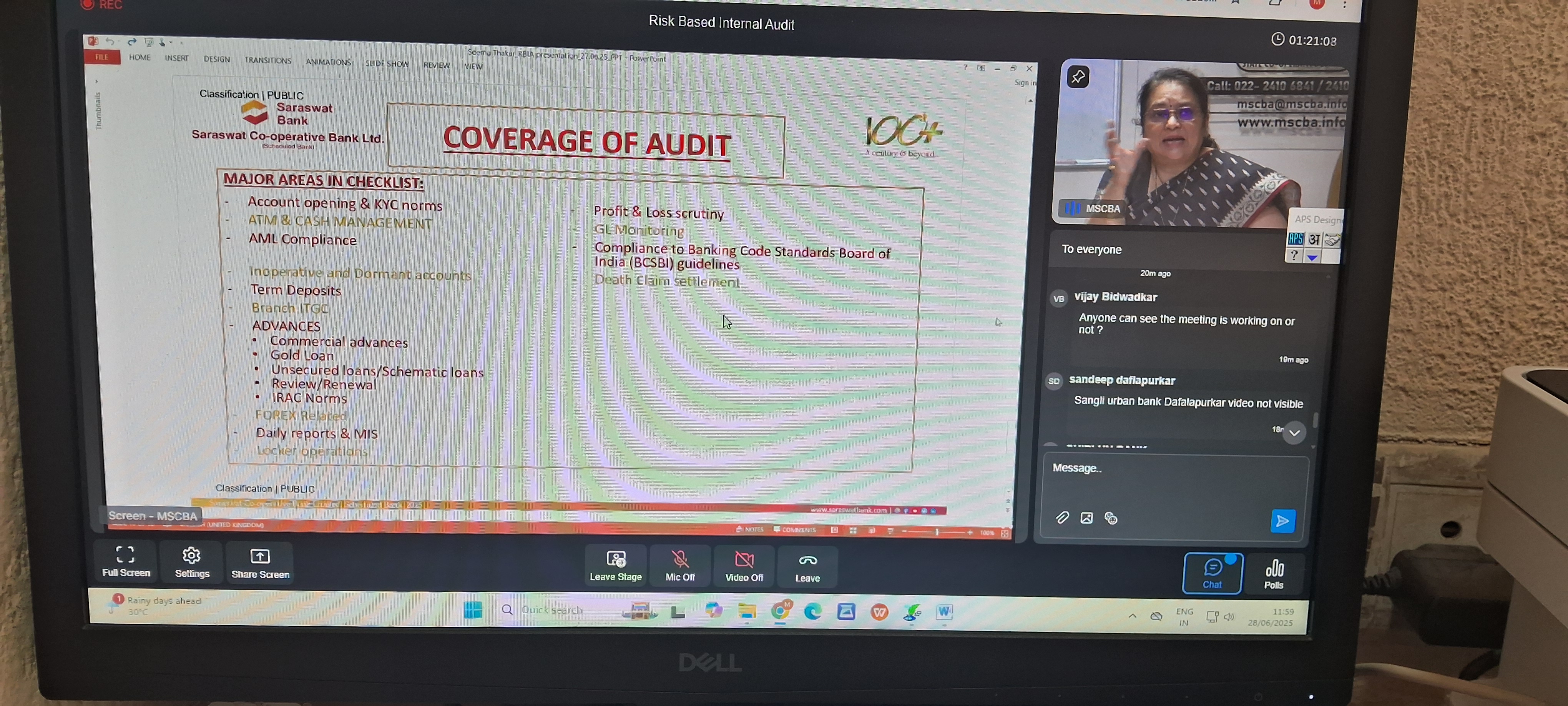 दुसरा व्हर्च्युअल प्रशिक्षण कार्यक्रम - श्रीमती सीमा ठाकूर, उपमुख्य महाव्यवस्थापक, सारस्वत सहकारी बँक लिमिटेड, मुंबई - २८/०६/२०२५ यांचे जोखीम आधारित अंतर्गत लेखापरीक्षण